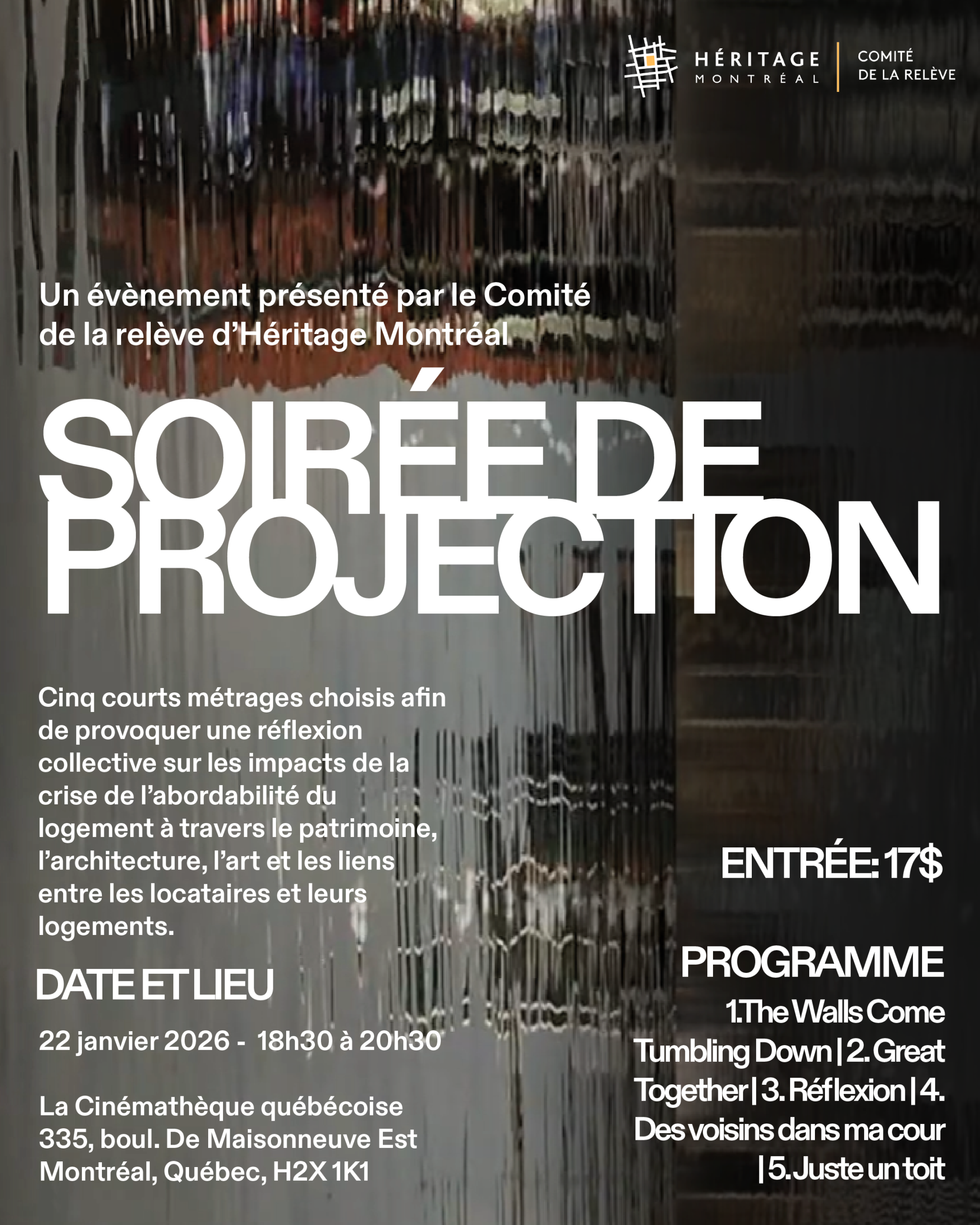 Le Comité de la Relève d’Héritage Montréal vous invite à une soirée projection de cinq courts-métrages documentaires portant sur les liens entre logement, architecture à patrimoine à Montréal et au-delà. Nous voulons provoquer une réflexion sur la crise de l’abordabilité du logement en explorant des sujets comme le patrimoine, l’architecture, le logement social et le droit des locataires. Les cinq films révèlent comment l’architecture devient outil de pouvoir et de résistance, d’émotion et d’inspiration, autant un espace d’injustice que le terrain d’une expérience urbaine commune.