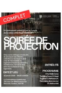 Le Comité de la Relève d’Héritage Montréal conviait le public à une soirée projection de cinq courts-métrages documentaires portant sur les liens entre logement, architecture à patrimoine à Montréal et au-delà. Nous voulons provoquer une réflexion sur la crise de l’abordabilité du logement en explorant des sujets comme le patrimoine, l’architecture, le logement social et le droit des locataires. Les cinq films révèlent comment l’architecture devient outil de pouvoir et de résistance, d’émotion et d’inspiration, autant un espace d’injustice que le terrain d’une expérience urbaine commune.